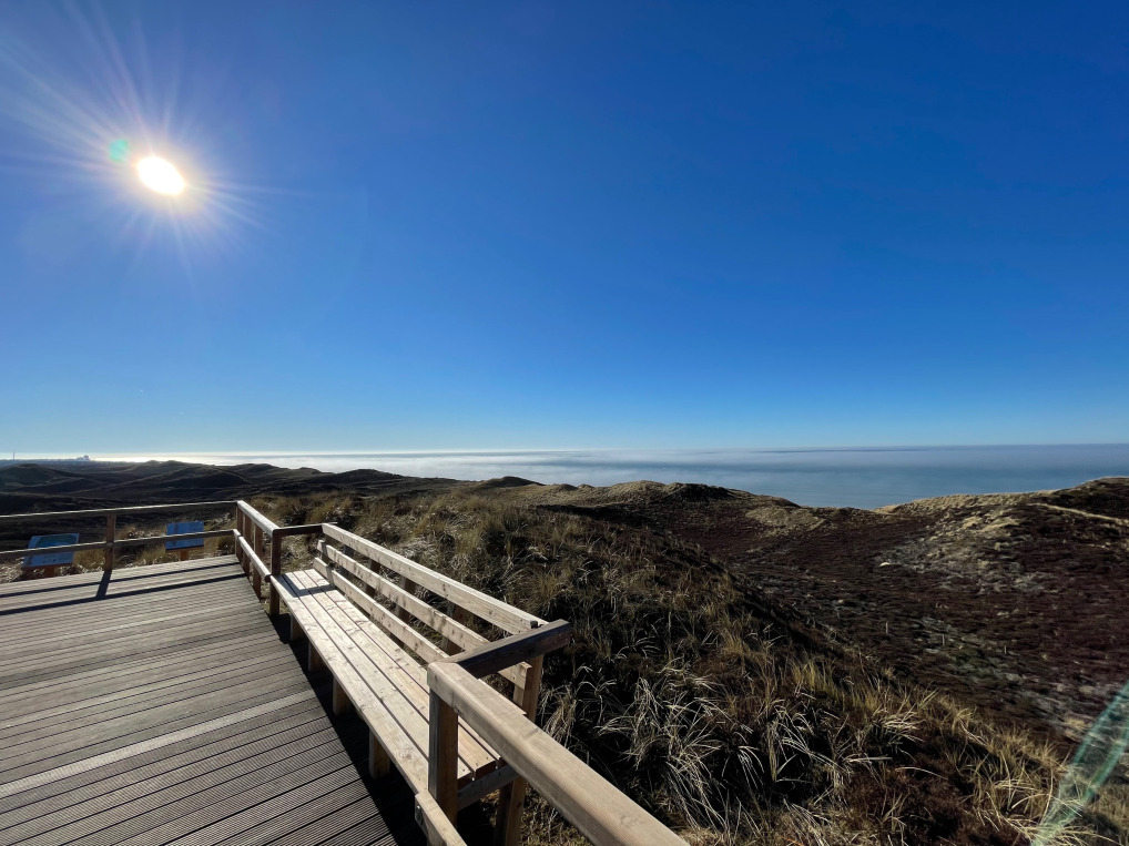 Über eine Holztreppe mit 110 Stufen gelangt man zur Aussichtsplattform auf ihrem Gipfel. Die Uwe Düne in Kampen ist mit 52,5 m über NN die höchste Erhebnung der Insel und wird im Umkreis von 40 km von keiner natürlichen Erhebung überragt. Der Ausblick umfasst große Teile der Mitte und des Nordens von Sylt und reicht bei entsprechendem Wetter bis weit auf das Meer hinaus, bis zur dänischen Nordseeinsel Rømø und zum Festland. Gen Süden zeigt sich Westerland mit dem "Metropol".